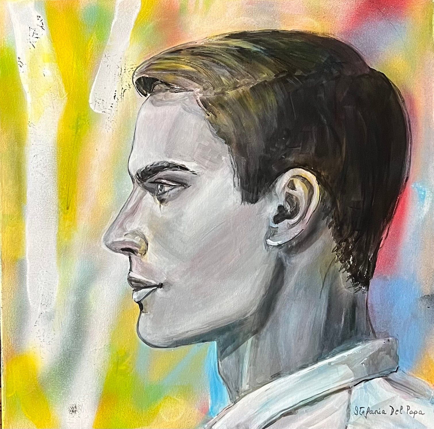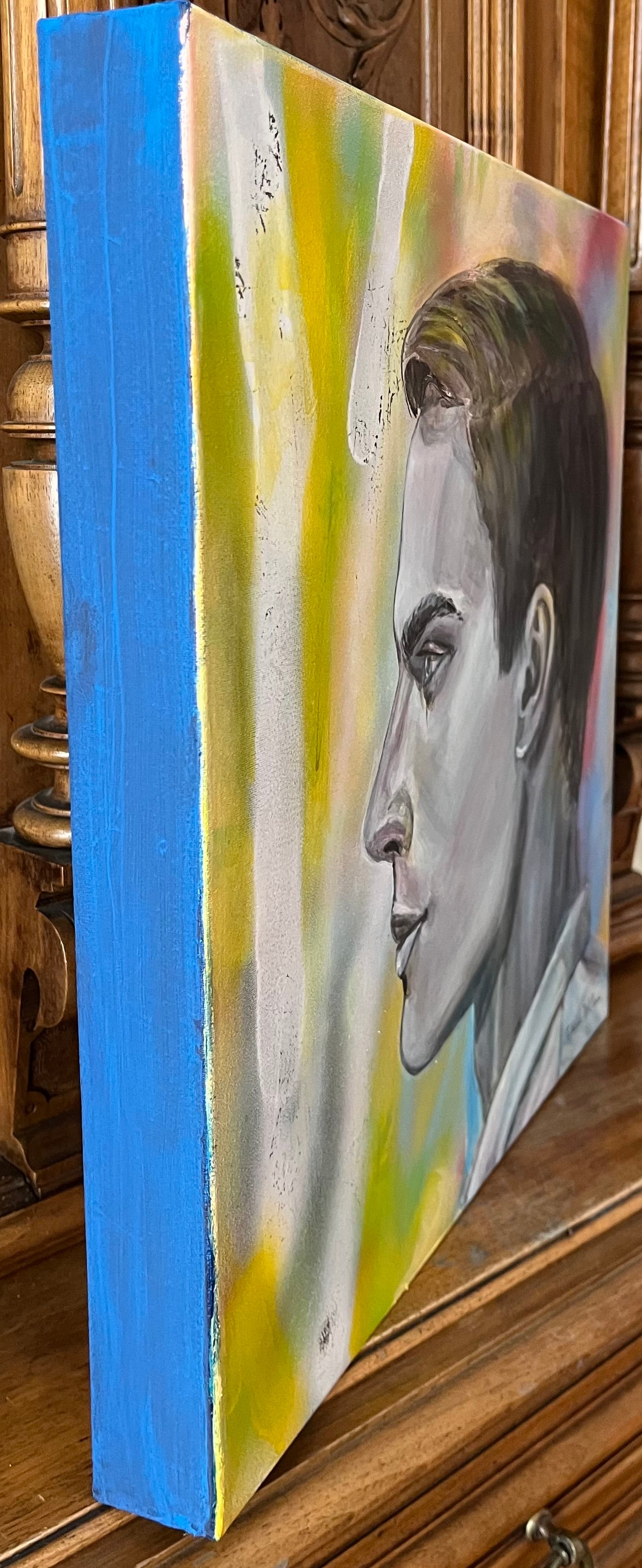Mixed media on gallery wrapped canvas, 40x40 cm (15.75x15.75 in). Sides painted blue.