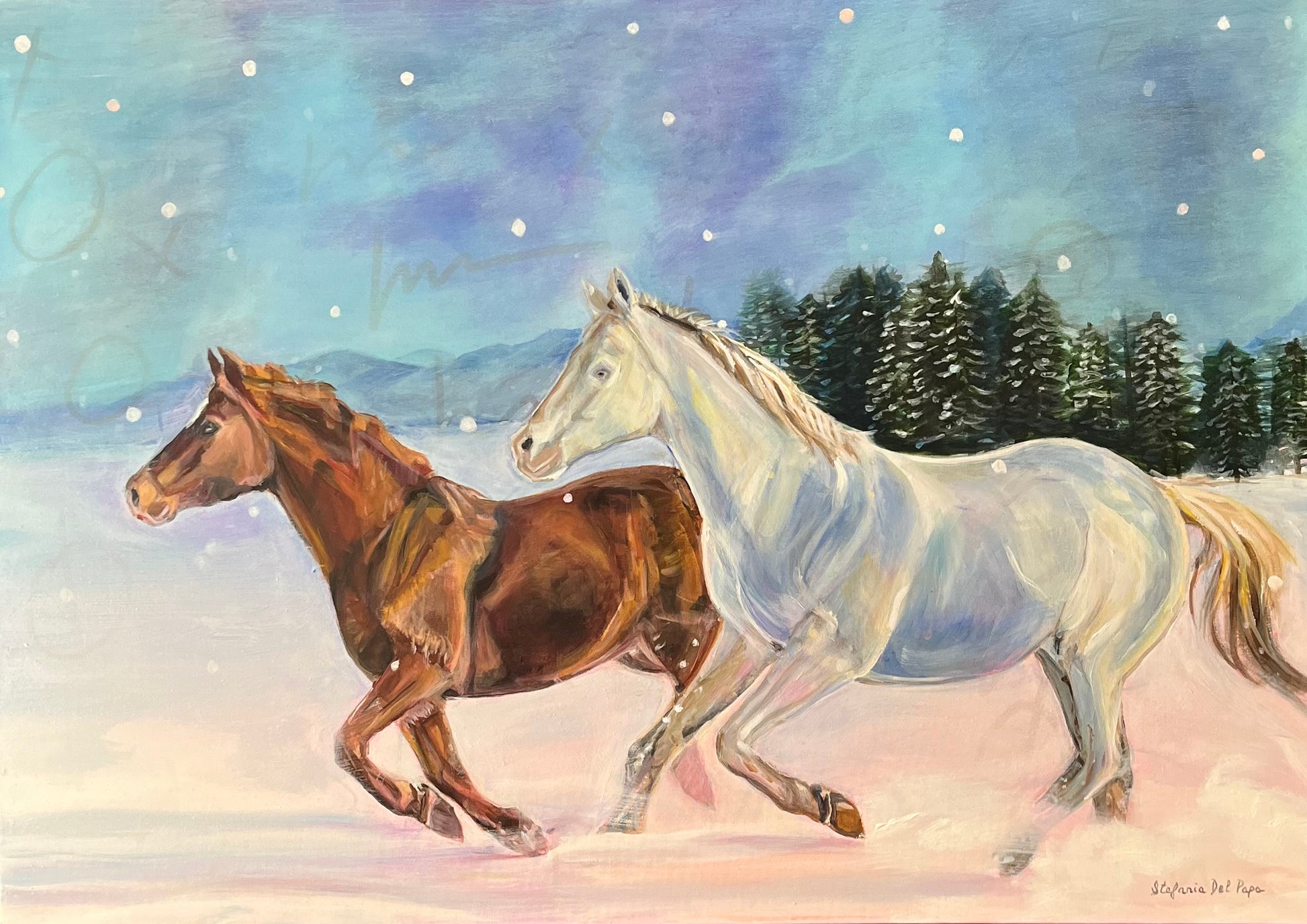 A brown and a white horse race across an open, snow-blanketed field. . The brown horse, its coat rich and earthy like dark chestnut, contrasts sharply with the glistening snow beneath its pounding hooves. Muscles ripple under its sleek hide as it surges forward with untamed energy. Beside it, the white horse gleams ethereally, almost blending with the snow, as if it were conjured from the night itself. Together they move like shadows and light, wild and free, vanishing into the night with only hoof prints left behind as proof they were ever there.